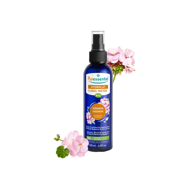 Découvrez l'Hydrolat de géranium rosat bio, idéal pour les peaux tiraillées et les imperfections. Il purifie et redonne de l'éclat à la peau.