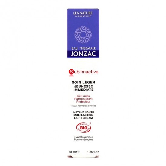 Eau de Jonzac Sublimactive Soin Léger Jeunesse Immédiate 40 ml offre une action anti-rides raffermissante et protectrice aux peaux matures normales à mixtes. Il prévient et corrige les signes de vieillissement cutané : ridules, rides, et perte de fermeté. Riche en Eau Thermale de Jonzac (25%), il offre des propriétés anti-irritantes et apaisantes. Résultats : la peau est lissée (96%*), les rides et ridules sont réduites (96%*), la peau est raffermie (95%*). Certifié bio par Ecocert. Hypoallergénique. Non comédogène. Testé sous contrôle dermatologique. 99% du total des ingrédients sont d'origine naturelle. 31% du total des ingrédients sont d'origine biologique. * Test réalisé sur 22 sujets pendant 28 jours.