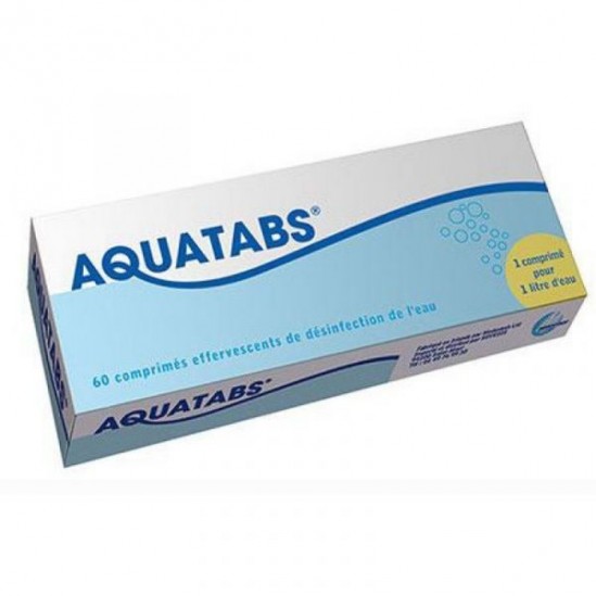 Boîte de 60 comprimés effervescents de désinfection de l’eau d'origine inconnue ou douteuse pour gourde ou autre contenant de 1 litre.