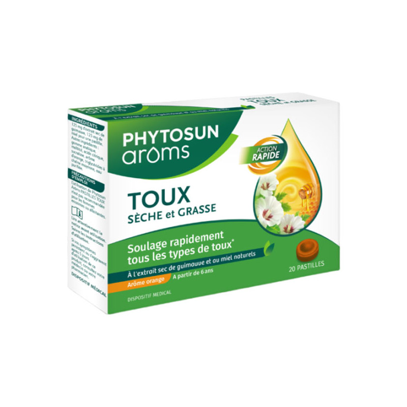 Les Pastilles Toux PHYTOSUN arôms sont des dispositifs médicaux, à action rapide, qui soulagent tous les types de toux (toux sèche et toux grasse) associées a ̀un rhume.