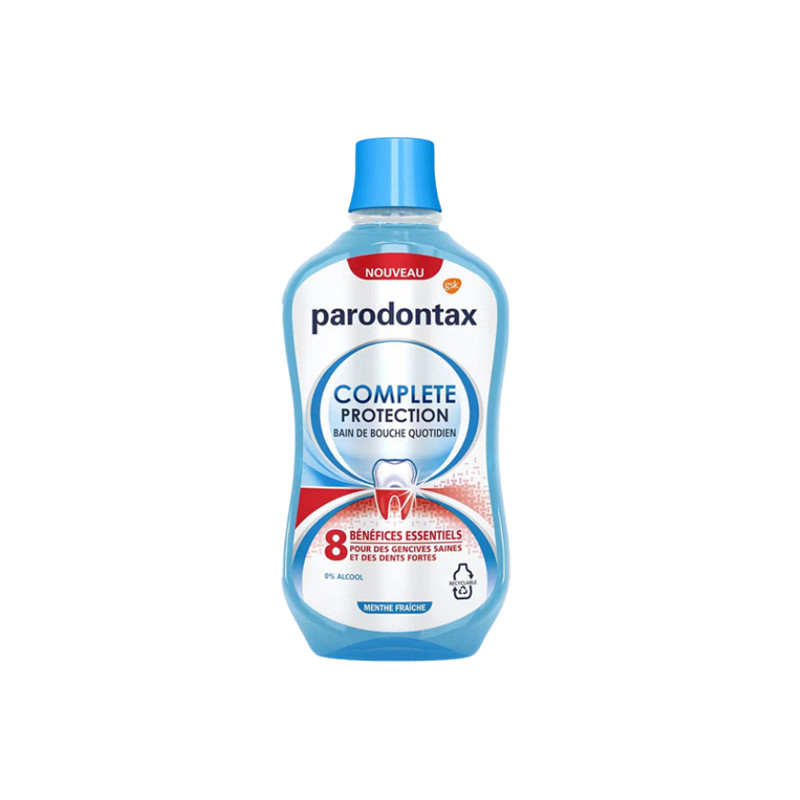 Le bain de bouche quotidien Parodontax Complete Protection vous offre une protection tout-en-un pour des gencives saines et des dents fortes quand il est utilisé en complément d’un dentifrice au fluor.
