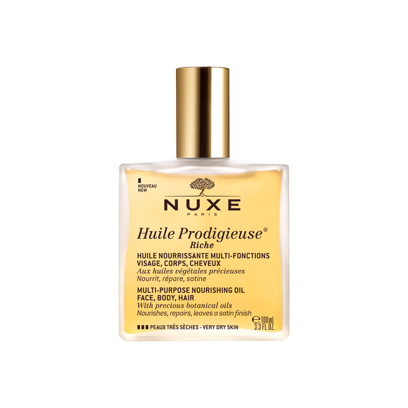 L'Huile Prodigieuse Riche nourrit intensément et sublime les peaux sèches à très sèches. En un seul geste, elle vous habille d'un irrésistible éclat satiné. Visage, corps et cheveux sont réparés, satinés.