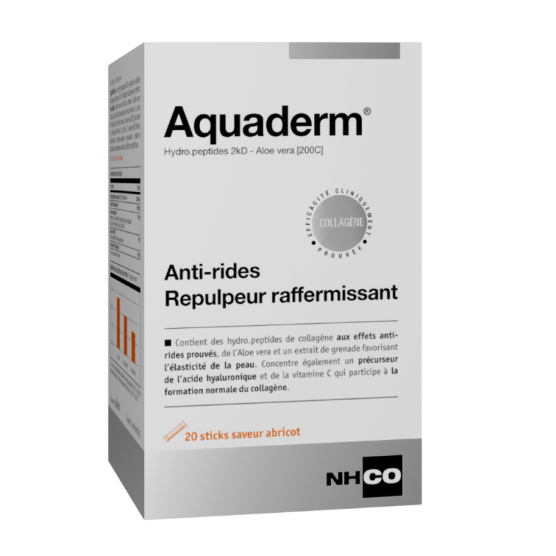 Aquaderm est un complément alimentaire qui favorise la beauté de la peau de l’intérieur. Il contient un actif breveté, Hydro.peptides 2kD, constitué de polypeptides d’acides aminés, dont l’efficacité sur la réduction de la profondeur des rides est scientifiquement prouvée. Il associe également un extrait d’aloe vera et de grenade, tous deux reconnus pour leur action bénéfique sur l’élasticité de la peau. De plus, il apporte du N-Acétyl-Glucosamine (NAG), un précurseur de l’acide hyaluronique, qui est essentiel pour maintenir l’hydratation de la peau.