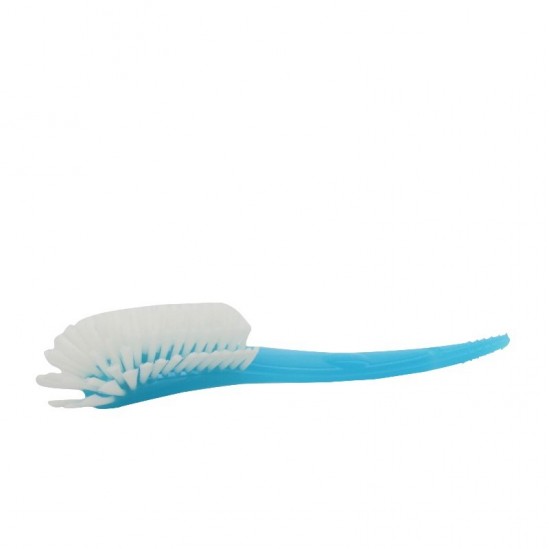 Brosse à bout recourbé pour nettoyage méticuleux de toutes les formes de biberon, avec nettoie-tétine intégré au manche.