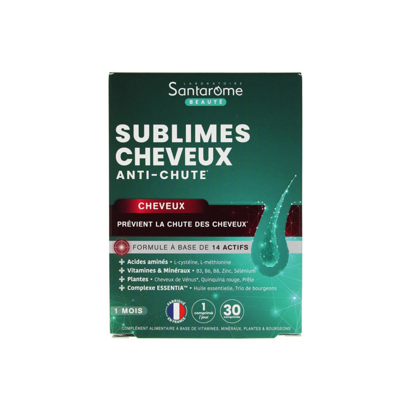 Sublimes Cheveux Anti-Chute - 30 Comprimés est composé d'un complexe ESSENTIA (huile essentielle de Géranium et un trio de bourgeons : Cassis, Orme blanc et Chêne), d'acides aminés (L-cystéine, L-méthionine), de vitamines et minéraux (B6, B8, Zinc et Sélénium), de Cheveux de Vénus, de Quinquina rouge et de Prêle.