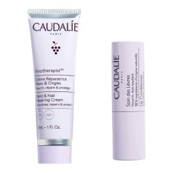 Prenez soin de vous avec le Duo Gourmand Mains & Lèvres Vinotherapist ! Dans ce coffret en édition limitée, craquez pour notre Crème Réparatrice Mains et Ongles Vinotherapist 30 ml et son allié hydratation le Soin des Lèvres. Gardez-les toujours à portée de main pour un hiver tout en douceur ! La Crème Réparatrice Mains et Ongles Vinotherapist nourrit et répare les mains sèches et abimées sans effet gras, tout en les protégeant de la déshydratation et des agressions extérieures. Enrichi en huile de pépins de raisin nourrissante et polyphénols de raisin anti-oxydants, le Soin des Lèvres protège et apaise durablement les lèvres sèches.