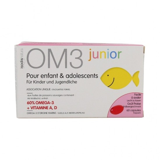 Huile de poissons sauvages concentrée (60% d'oméga-3) xylitol (édulcorant) silice colloïdale vitamine E certifiée non OGM arôme fraise lécithine de colza eau purifiée extrait d'huile de romarin vitamine A (Palmitate) et vitamine D3 (Cholécalciférol). Contenant : gélatine eau glycérol arôme fraise. OM3junior contient du xylitol un édulcorant naturellement présent dans les fruits et reconnu par L'Union Française pour la Santé Bucco-dentaire (UFSBD) pour son action préventive sur la carie dentaire.