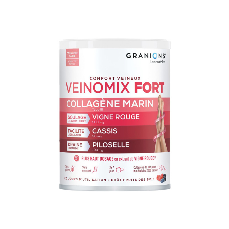 Le Laboratoire des GRANIONS, fort de son expertise pharmaceutique depuis 1948, a mis au point VEINOMIX FORT, une solution complète qui associe les vertus d’une sélection de plantes, de vitamines et d’oligoéléments de haute qualité, pour apporter légèreté, confort et bien-être quotidien à vos jambes.
