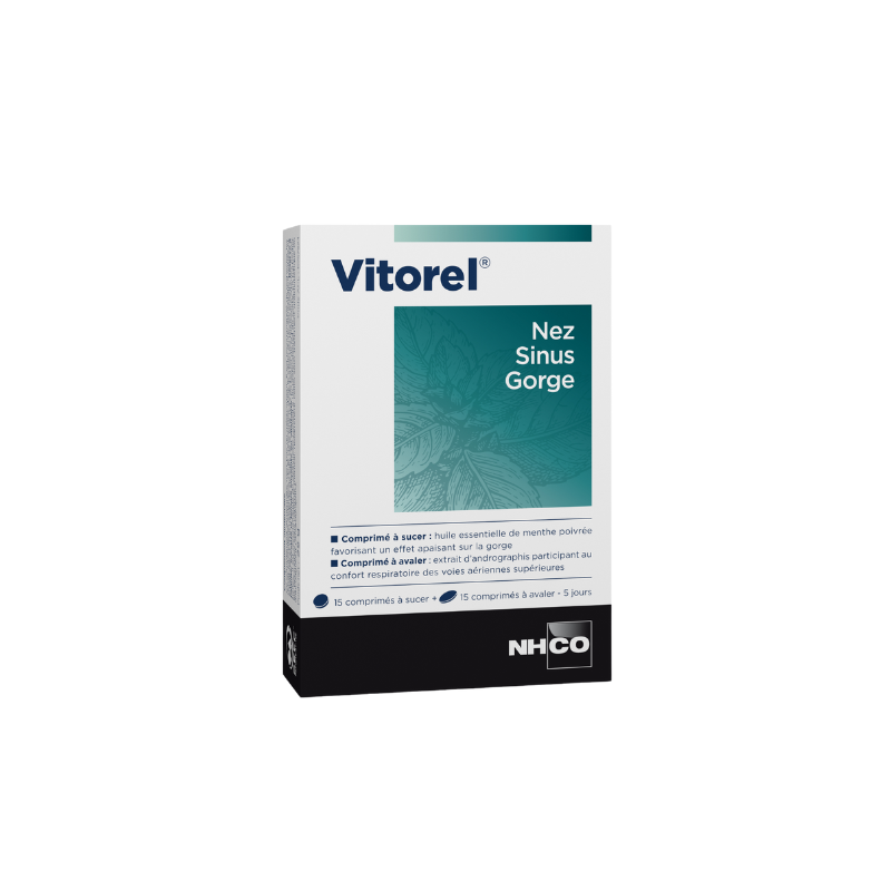 Vitorel contient des comprimés à sucer pour une action apaisante sur la gorge ainsi que des comprimés à avaler pour une action sur le confort des voies respiratoires inférieures (en particulier au niveau du nez, des sinus et de la gorge).