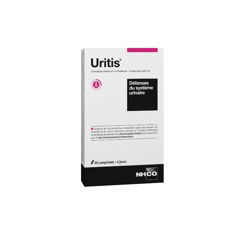 D-Mannose, agent de charge : sorbitol, L-Méthionine, anti-agglomérants : carbonate et stéarate de magnésium, extrait de feuilles de romarin (Rosmarinus officinalis), extrait de fruits de cranberry (Vaccinum macrocarpon), extrait de feuilles de cassis (Ribes nigrum), extrait de parties aériennes d’échinacée (Echinacea purpurea), vitamine C (acide ascorbique), extrait de racines de pissenlit (Taraxacum officinale).