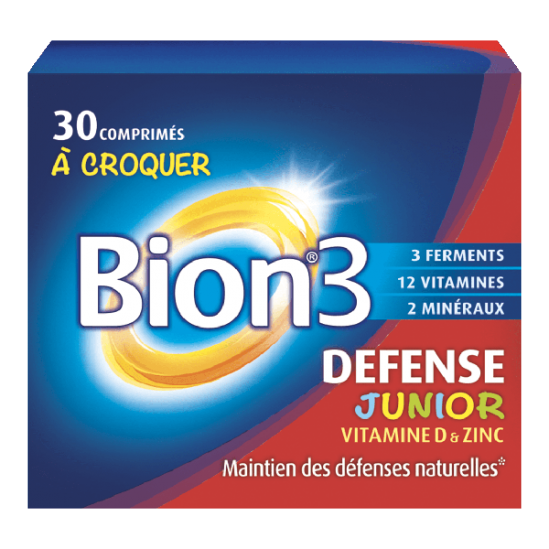 - Vous redoutez l’arrivée de l'hiver ainsi que la rentrée à l’école de vos enfants ? Même les plus petits ont parfois besoin d’un coup de pouce pour soutenir leur système immunitaire ! Bion3 Défense Junior est un complément alimentaire contenant des vitamines, notamment de la vitamine D qui aide les défenses immunitaires des enfants. Cette combinaison de vitamines pour junior est spécialement conçue pour les enfants, qui peuvent le prendre dès l’âge de quatre ans. Ce complément alimentaire contient une combinaison unique de vitamines, minéraux et ferments microbiotiques.
