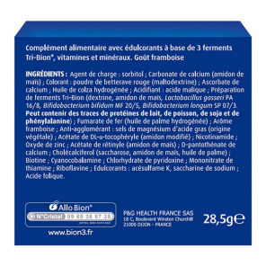 3 Souches microbiotiques Tri-Bion®: Lactobacillus gasseri PA 16/8, Bifidobacterium bifidum MF 20/5, Bifidobacterium longum SP 07/3