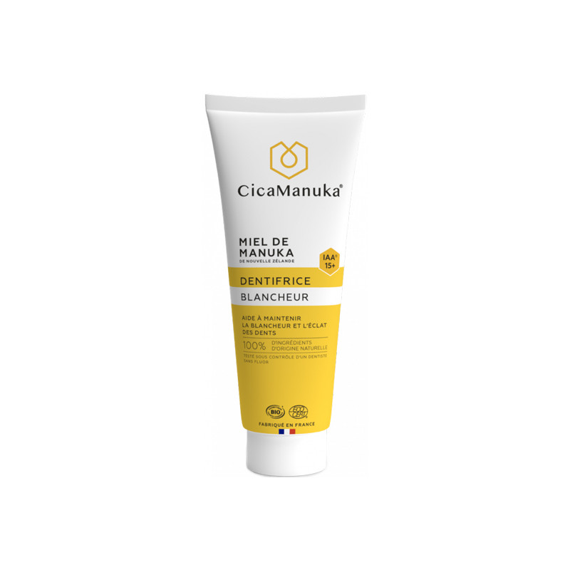 Formulé à base d’ingrédients 100% d’origine naturelle enrichi en miel de Manuka IAA15+ aux propriétés anti-bactériennes et réparatrices, de propolis et d’huile essentielle de Manuka, le dentifrice blancheur nettoie en profondeur, préserve la blancheur naturelle et maintient l’éclat des dents sans altérer l’émail pour un sourire sublimé.