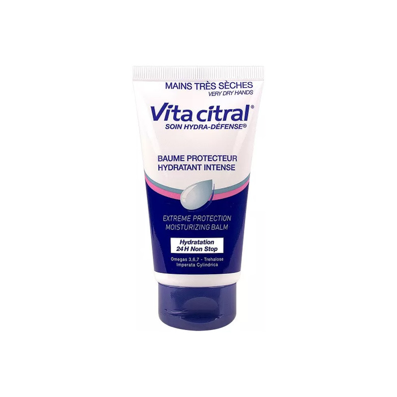 Vitacitral Baume Protecteur Hydratant Intense 75 ml permet une protection des mains contre la déshydratation sévère et les rugosités engendrées par les agressions répétées (froid, sècheresse de l'air, eau, produits agressifs, travaux professionnels et ménagers, bricolage, jardinage). Il apaise les mains douloureuses et les enveloppe d'un voile protecteur soyeux. Sans paraben.