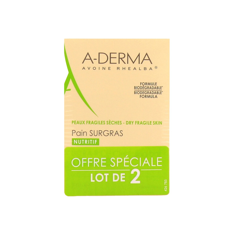 Aderma Pain Surgras Lot de 2 x 100 g à l'avoine rhealba d'origine biologique nettoie, nourrit, protège le visage et le corps de toute la famille. Idéal pour les peaux sèches, il respecte le film hydrolipidique cutané et laisse un film protecteur très confortable.