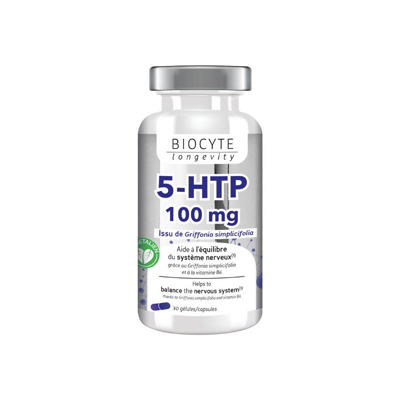Biocyte 5-HTP 100mg est un complément alimentaire contenant du 5-Hydroxytryptophane (5-HTP) hautement dosé à 100mg, extrait du Griffonia (Griffonia simplicifolia). Associé à de la vitamine B6, notre formule est complète pour aider à retrouver sérénité et calme. Une baisse de moral, des envies de grignotages incontrôlables, un manque de sérénité, tant de situations qui sur une longue période peuvent amener votre corps à être épuisé physiquement et psychologiquement. Votre organisme se fatigue et se fragilise.