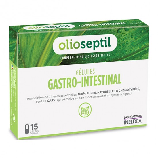 Présenté en gélules végétales, OLIOSEPTIL® Gastro-intestinal est un complexe d’huiles essentielles 100% pures et naturelles et chémotypées, micro-émulsionnées sur un support d’huile d’olive de 1ère pression à froid, en gélule végétale. Ce complexe contient notamment de l’huile essentielle de Carvi, qui participe à l’assainissement et au bon fonctionnement du système digestif. Idéal en cas de sensibilité individuelle ou de changements d’habitudes alimentaires (repas pris hors domicile, déplacement à l’étranger…).